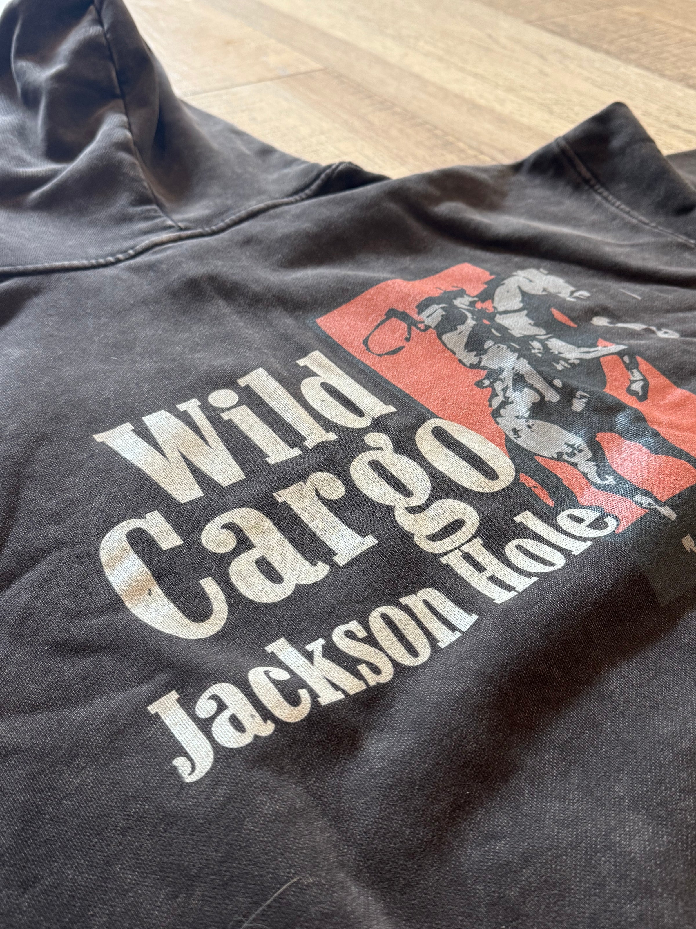 Our famous "Bucking Bronc" art on a sun-faded, heavyweight hoodie.